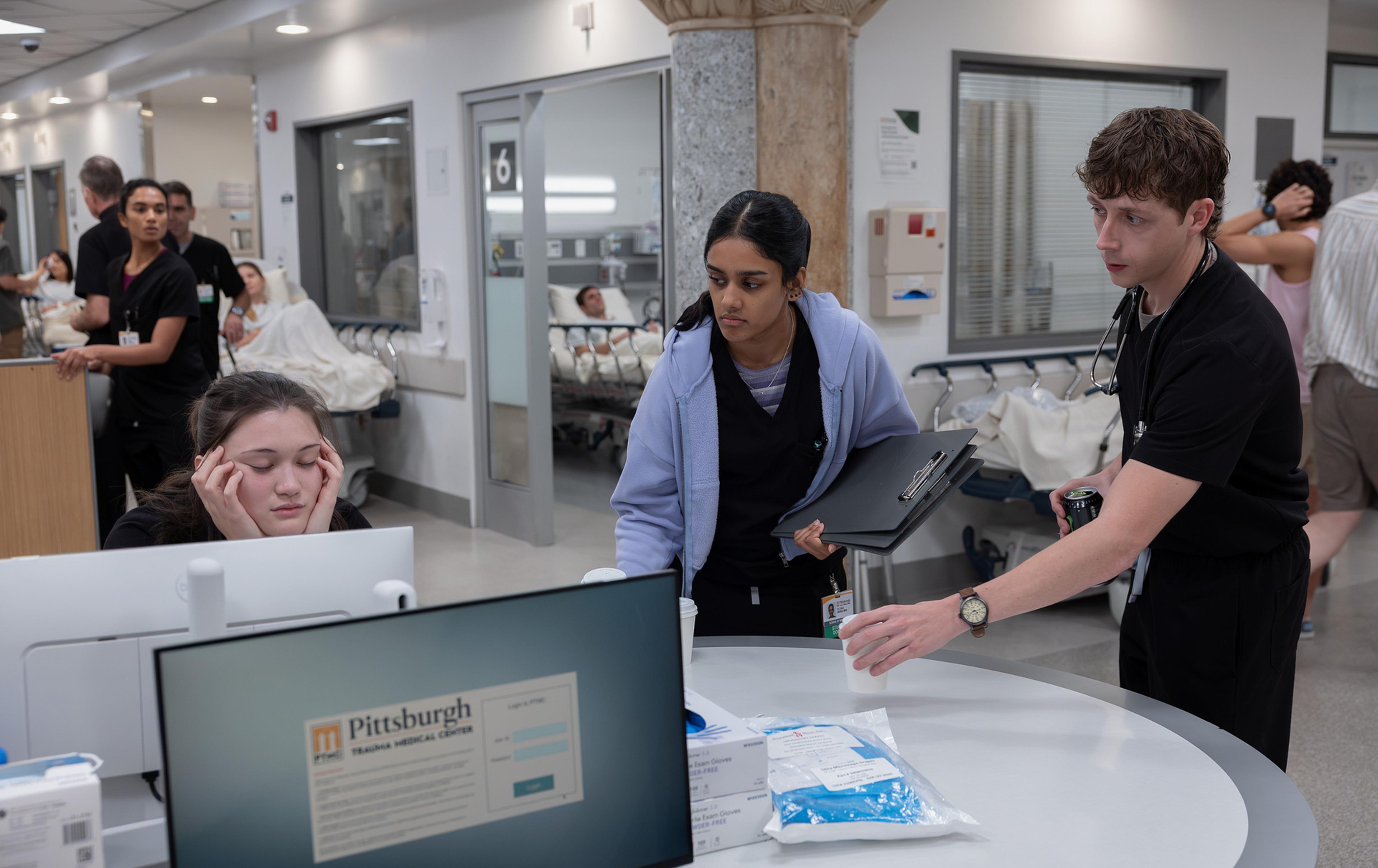 (L-R): Isa Briones as Santos, Shabana Azeez as Javadi, and Gerran Howell as Whitaker in The Pitt Season 3 finale. Warrick Page—HBO