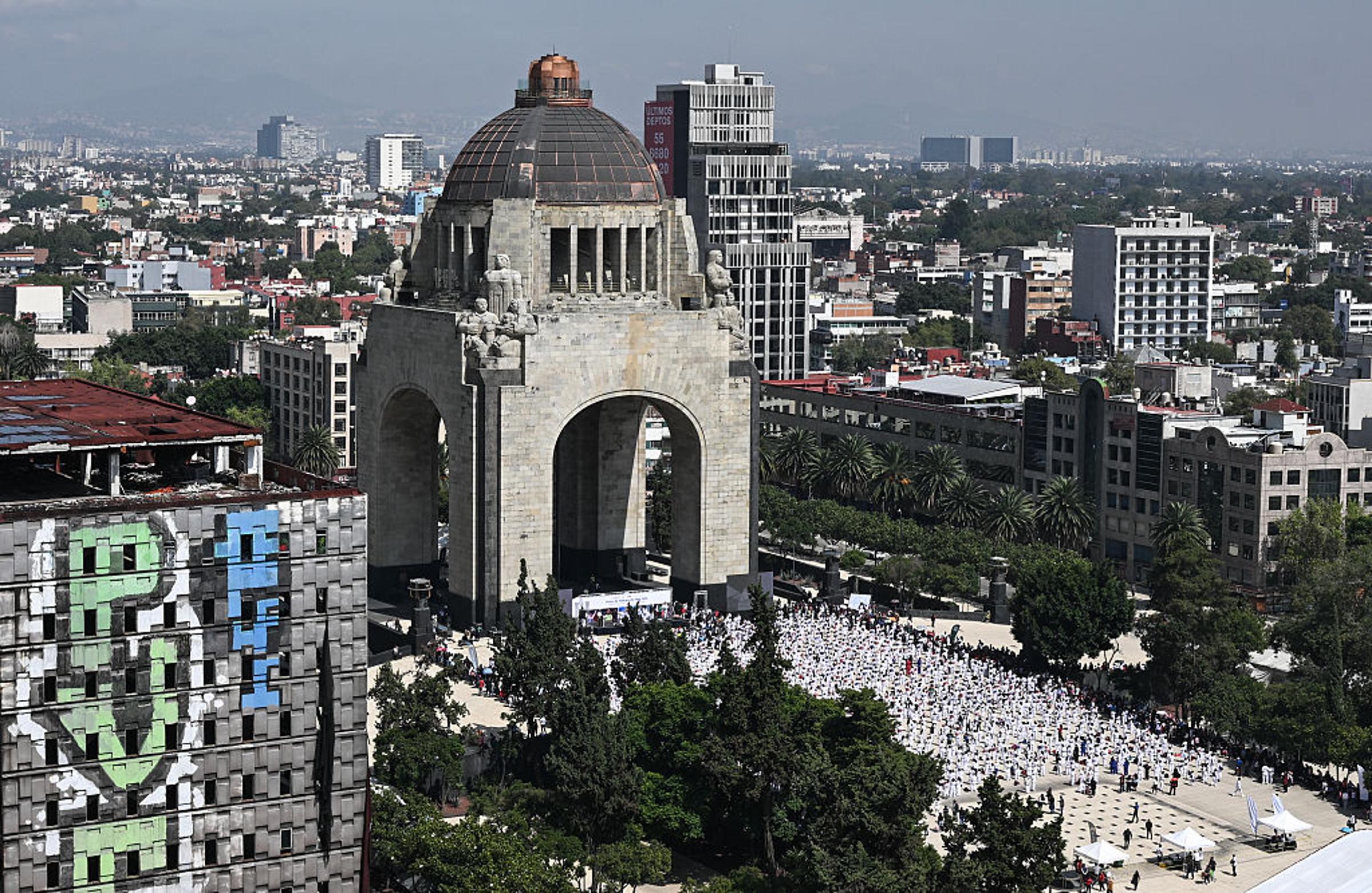 Aerial view of taekwondo students from different categories participating in a massive clinic given by Mexican taekwondo legends at the Monumento a la Revolucion Square in Mexico City on August 2, 2025. Yuri Cortez—AFP via Getty Images