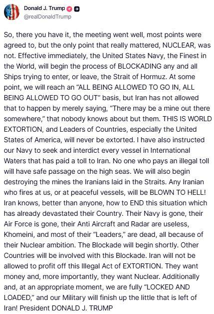 « À un moment donné, nous parviendrons à une situation où TOUT LE MONDE POURRA ENTRER ET TOUT LE MONDE POURRA SORTIR “, mais l’Iran ne l’a pas permis, se contentant de dire : " Il pourrait y avoir une mine quelque part ”, que personne ne connaît à part eux. C’EST DE L’EXTORSION À L’ÉCHELLE MONDIALE et les dirigeants des pays, en particulier ceux des États-Unis, ne seront jamais victimes d’extorsion », a ajouté le président américain.
