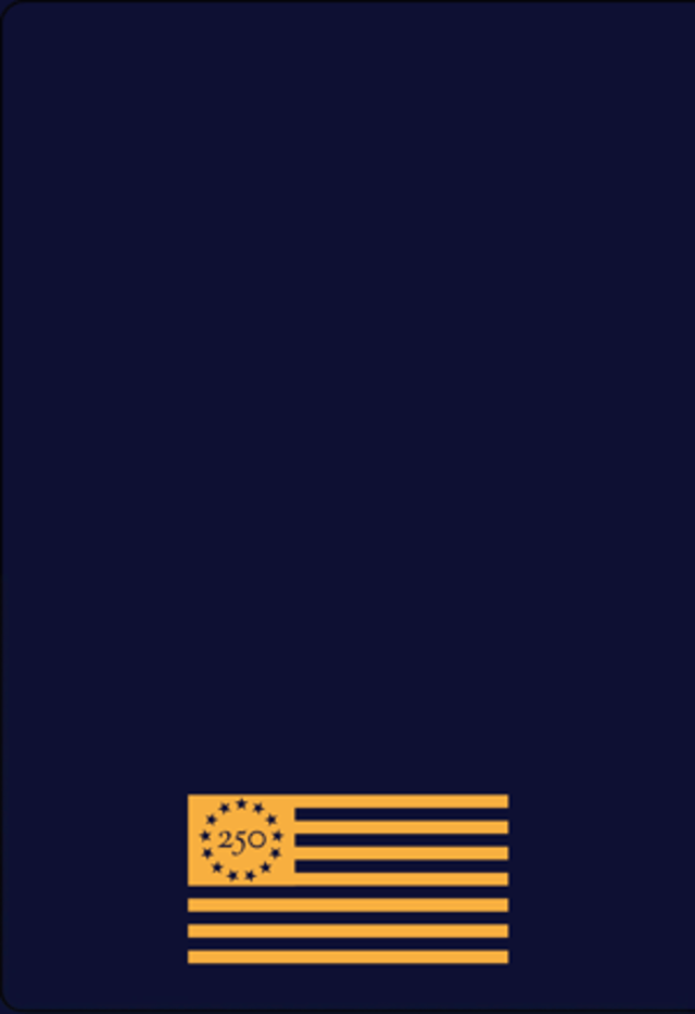 The back of the passport will display an image of the 1777 version of the American flag, with “250” inscribed at the center of 13 stars representing the original colonies.
