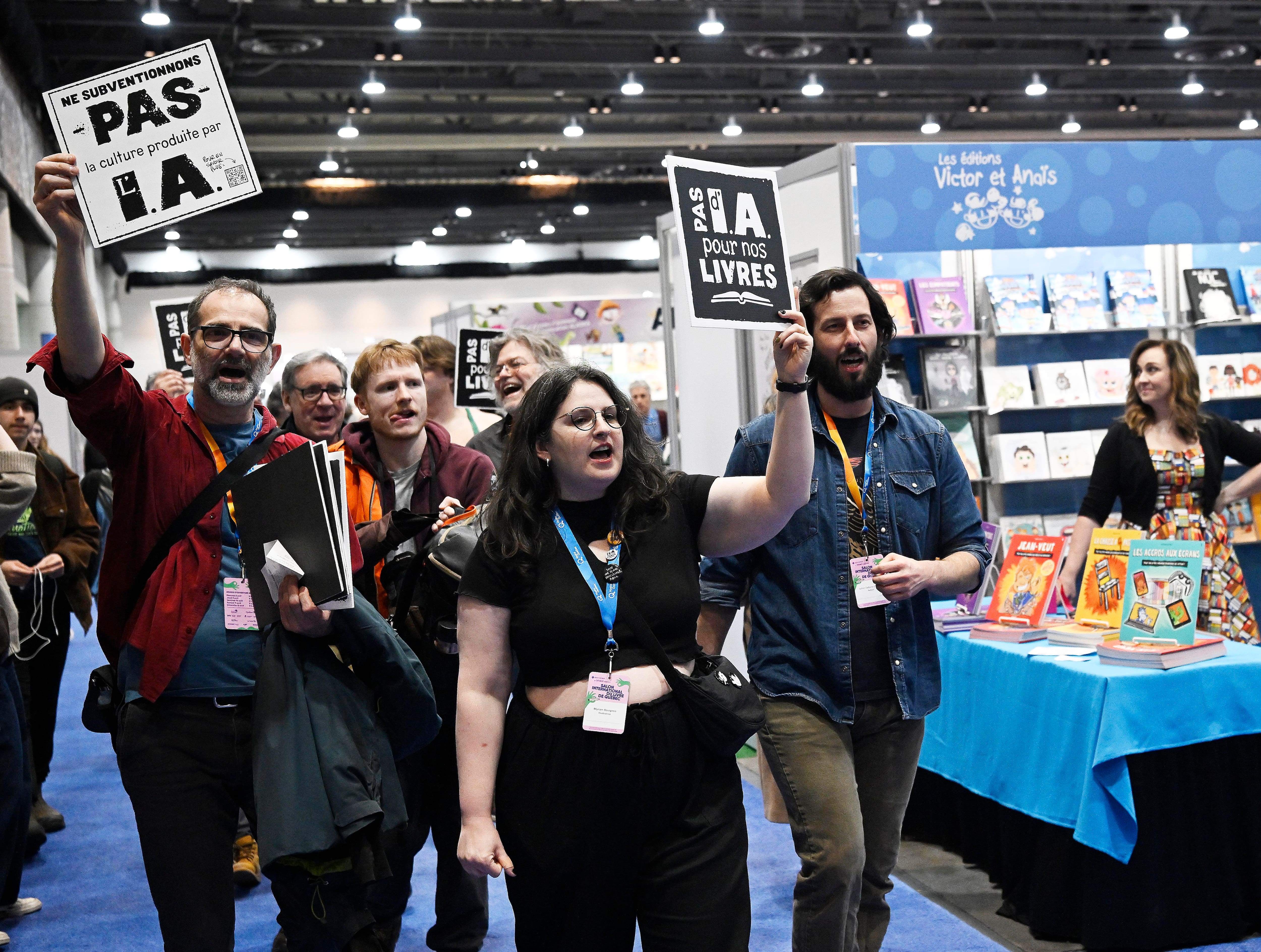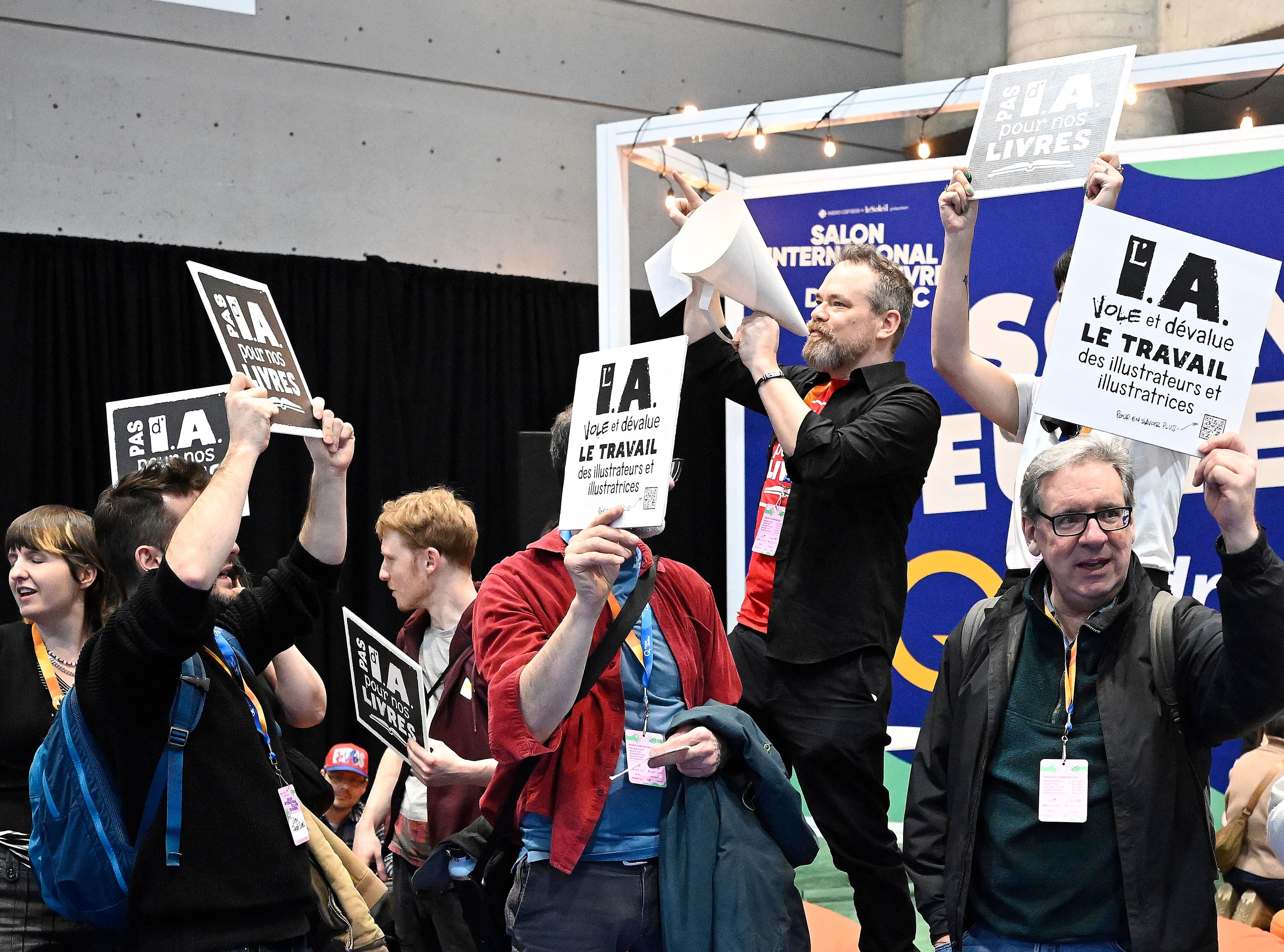 « Pas d’IA dans nos livres, l’art est humain ! », ont scandé à répétition auteurs, illustrateurs et sympathisants réunis samedi au Salon international du livre de Québec (SILQ) lors d’un rassemblement qui visait à dénoncer l’utilisation de l’intelligence artificielle générative en édition.