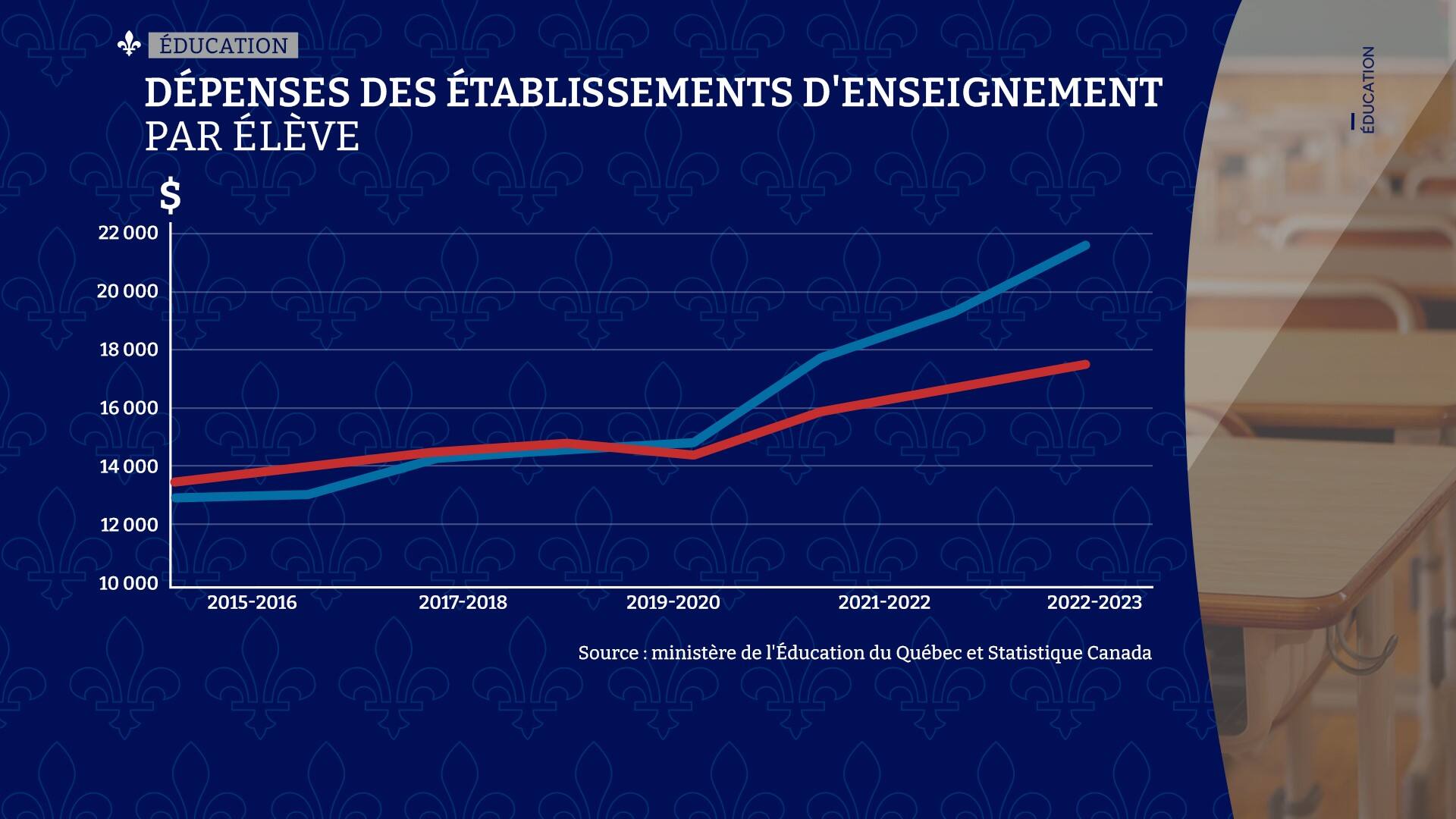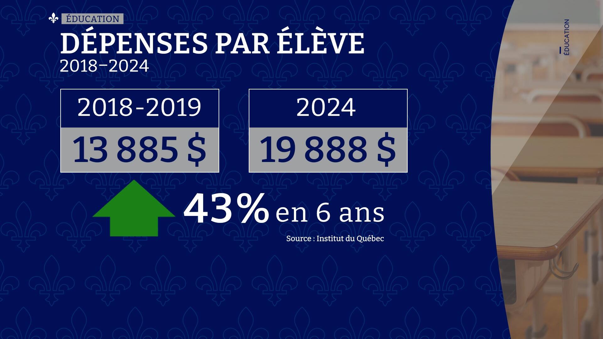 En ce qui concerne les dépenses par élève, l’augmentation est de 43%, pour atteindre 19 888$ en 2024.