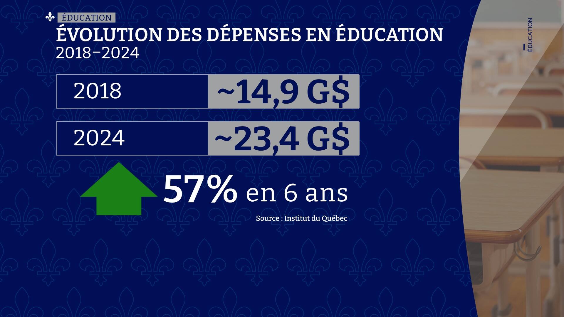 Les dépenses en éducation ont augmenté de 57% en six ans, passant de 14,9 G$ à 23,4 G$, selon des données publiées par l’Institut du Québec.