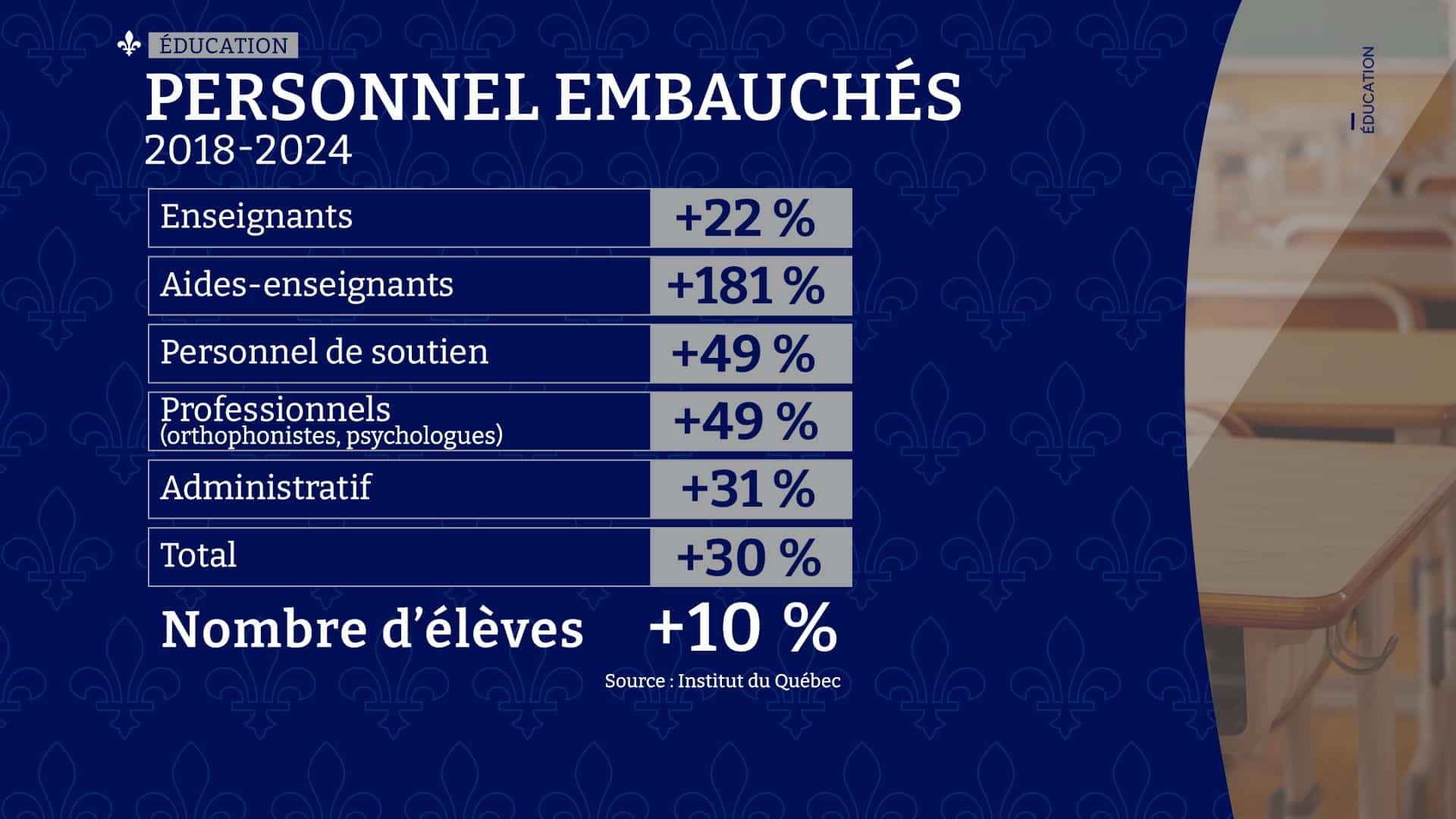 En moyenne, incluant le personnel de soutien, les enseignants et autres membres du personnel, une hausse de 30% est constatée. Notons que le nombre d'élèves est en hausse de 10%, on peut donc observer une hausse moins importante que le personnel embauché.