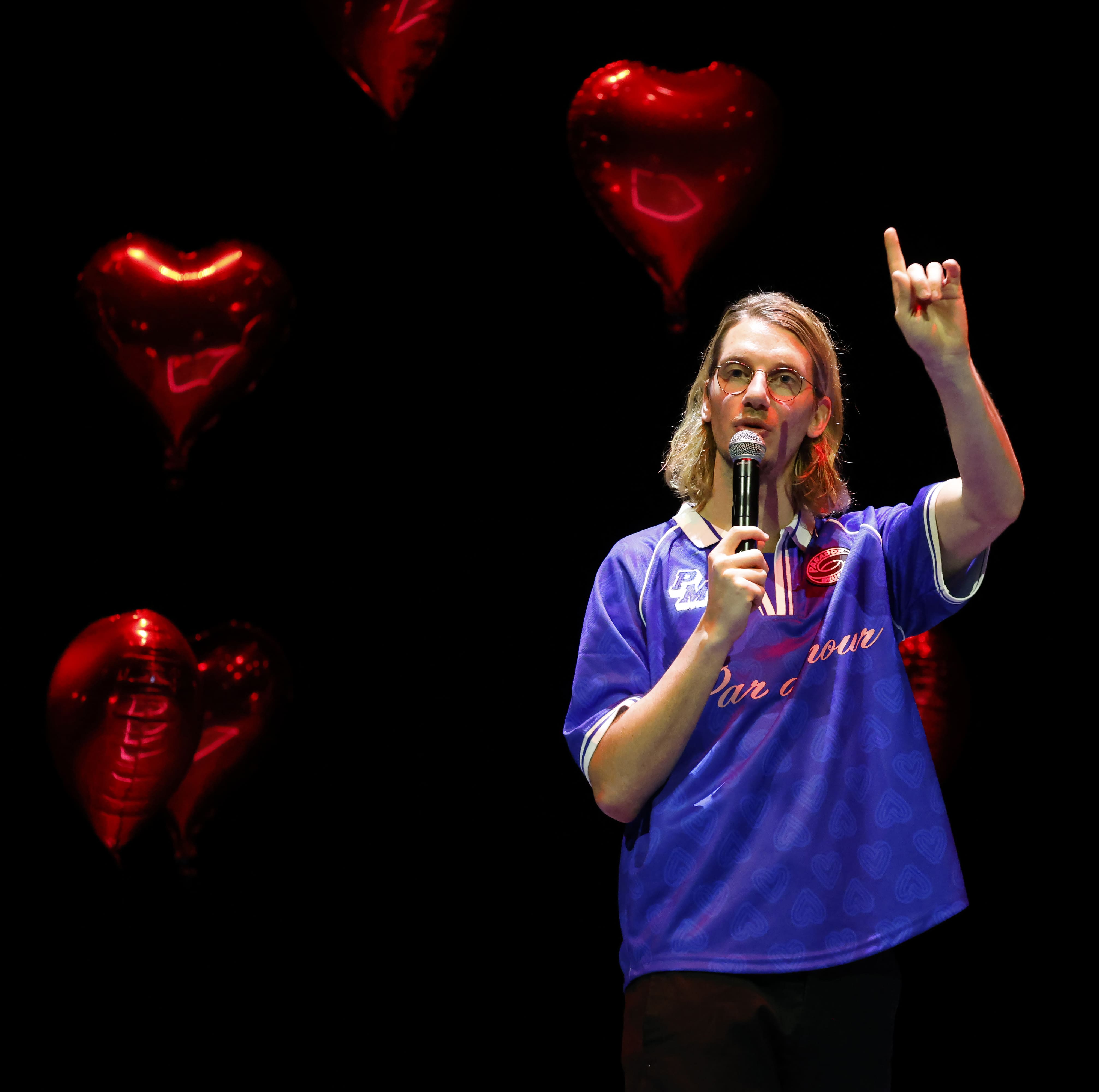 Après deux courtes premières parties, avec Charles Brunet et Mahé, Paul Mirabel s’est pointé sur scène, entourée de cœurs gonflables, en faisant quelques petits pas de danse.